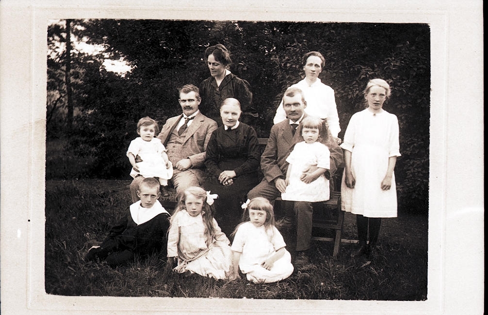 Anna-Lisa Abrahamssons 80-årsdag den 29/5 1919 i trädgården till Rantens gård (nuvarande Rangården). Sonen Filip Abrahamsson f. 1876 d. 1950 gift med Augusta Svärd f. 1881 d. ? Dotter Ebba f. 1918. Sonen John Franzén (skräddaremästare) f. 10/2 1880 d. 3/8 1931 gift med Hilma f. Jacobsson f. 1879 d. 1943. barnen Lisa, John-Erik, Ruth, Lilly, Britta. Bakre raden: Augusta och Hilma. Mellersta raden: Ebba, Filip, Anna-Lisa, John, Britta, Lisa. Främre raden: John-Erik, Ruth och Lilly. Reprofotografier från Lisa Franzéns album. Rangården, Falköping.