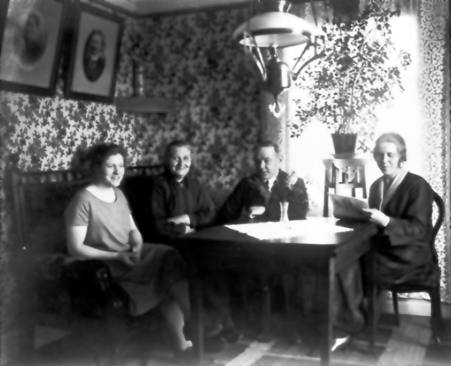 I finrummet på Store Hed. Elisabet "Lisa" Johansson-Karlsson, Agda Andersdtr-Johansson, Gustaf Hulting, Stina Johansson.