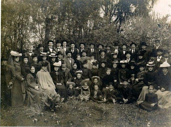 Föreningen Enigheten. Övre raden från vänster: Gideon Björk, gasmästare Andersson, Arvid Wickström, Hjalmar Wickström, Otto Nilsson, Arvid Johansson, Pompeius, Allan Lind, Johan Björk, Fritiof Jansson, Johan Karlsson, Folke Malmsten, Erik Bengtsson, Johansson, Oskar Bark. Andra raden: Jansson, Eva Jonsson, okänd, Anna Björk, Olga Lind, Augusta Götberg, Karl Persson, Svante Medén, Alma Larsson, Carl Ludvig Hansson, Emma Jacobsson, Alfred Jonsson, Hanna Larsson, Karl Rydell, Hanna Rydell, Lindstrand, Teofil Fäldt, Gust. Malmsten. Tredje raden: Augusta Björk, Matilda Blomgren, Amanda Malmsten, Hulander, Andersson, Hansson, Anna Lindstrand, Sofia Jonsson, Edit Berglund, Ester Jonsson, Ellen Lindström ?, Ingegärd Karlberg, Helga Bengtsson, Maja Lindström. Fjärde raden: Barnen Eva Björk, Mia Medén, Emy Jonsson, Magnhild Malmsten, Bertil Lindstrand, Ernst Jonsson, Erik Malmsten, Märta Björk.