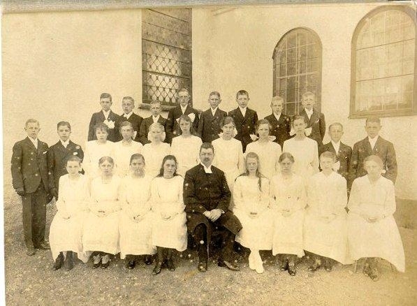 Kyrkoherde Fritz Wetterholm med konfirmander och Samskolans elever år 1918 i Falköping. 1:a raden fr.v: 1. Elsa Andersson född 1903, 2. Dagny Hedström, f. 1902, gift Kahlefeldt. 3. Brita Brandt, f. 1903. 4. Nora Zellén, f. 1904. 5. Fritz Wetterholm, kyrkoherde. 6. Margot Ewertz, f. 1904. 7. Stina Halldén, f. 1904. 8. Hillevi Eklöf, f. 1904, död 1918. 9. Dagny Smedberg f. 1903. og. 2:a raden fr.v. 10. Einar Läth f. 1904. 11. Rudolf Westlin f.1903. 12. Anna Bergqvist f.1904. 13. Lilly Fagerberg f. 1903. 14. Edla Wallqvist f. 1903 og. 15. Märta Englund, f. 1903 og. död 1971. 16. Brita Carlberg f. 1903. og. 17. Vega Karlsson f.1904, og. 18. Svea Käck f. 1902 gift Linnarsson 19. Allan Lindh f. 1904 emigrerat till USA. 20. Gustav Svensson f. 1903 (Sonholm) 3:e raden fr.v. 21 Gösta Alexandersson f. 1904. 22. Otto Andersson, f. 1903. 23. Ivar Nilsson f.1903. 24. Gunnar Nordin, f. 1903. 25. Sven Gustafsson, f. 1903. 26. Hans Johansson, f. 1903. 27. Sven-Axel Hagberg, f. 1903. 28. Arne Florén.