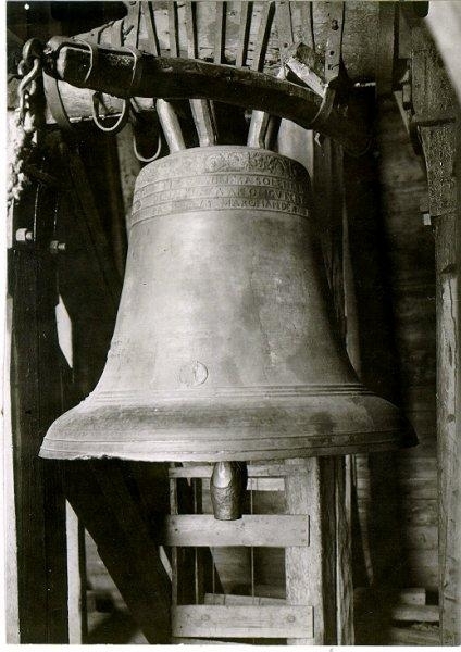 S:t Olofs kyrka. Storklockan från år 1669.Texten överst på klockan har följ. lydelse, 113 PSAL: I. FRA. SOLENES. UPGANG. ALT. INTIL. DENA. KLAKA. ÄR. OMGUTEN. på. HELA. FALKIOPINGS. FORSAMLINGS. BEKOSTNAT. ANNO. 1669. PAST. LAUR. MARCHANDER. BORGM. IACOP. IONSON. RADM. IACOP. IONSON: E: T: S. Längre ned på klockan läses vidare: W: H: G: HARALD. STAKE. TIL. WIKA.-W: H: CARL. PEDERSON. TIL. SNOBECK.