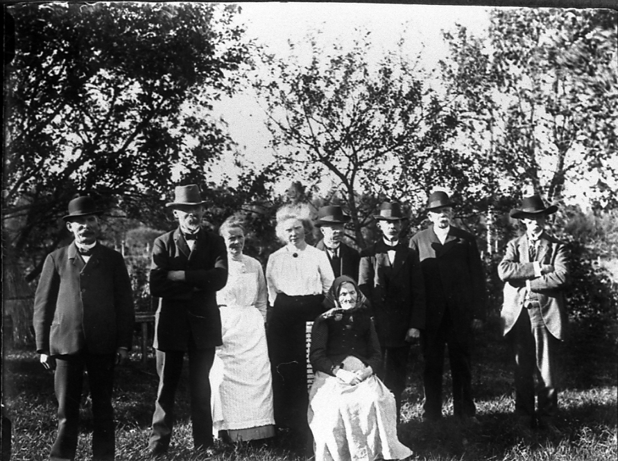 Glömme. Sanfrid, Johan och Selma Gustavsson Glömme, Berta på Veken, Sanfrid Johansson Veken, Gideon och Oskar Gustavsson Glömme, svenskamerikanen Aron Eriksson Brunnsnäs. Franför Maja Stina, mor till Sanfrid, Johan och Selma.
