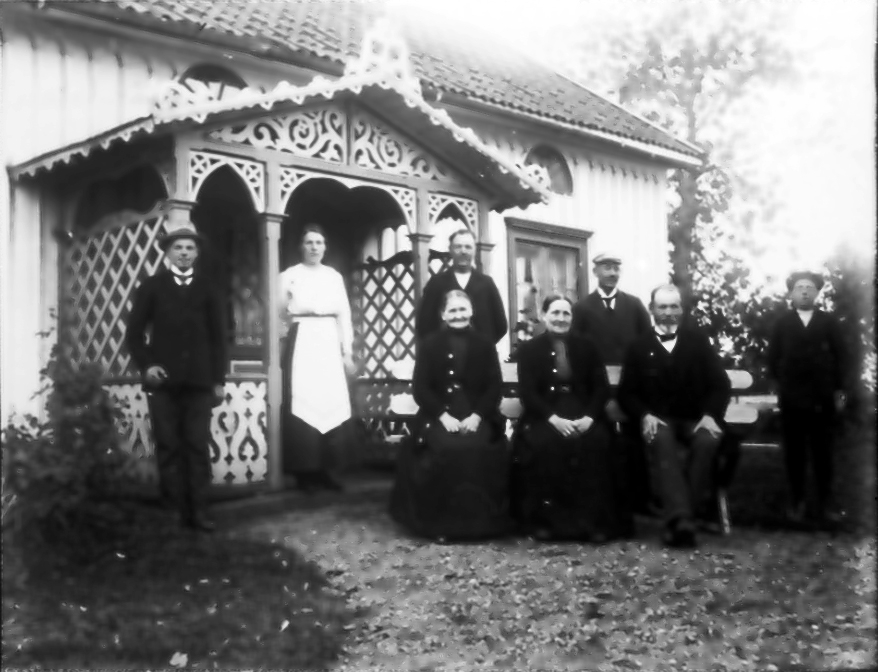 Gunkestorp. Okänd, Beda Setterberg med make. Stående Herbert Johansson, Tekla Setterberg, Alexander Jonsson, Herman Jonsson, okänd pojke.