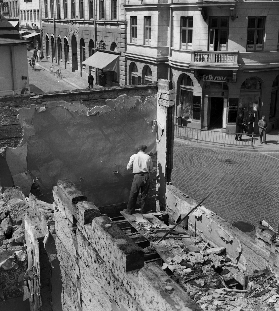 Den sk Holmströmska gården på Storgatan 36 revs sommaren 1950. Efter rivningen lades den här tomten ut som gatumark. Det förklarar varför ingen fastighet idag har adressen Storgatan 36.