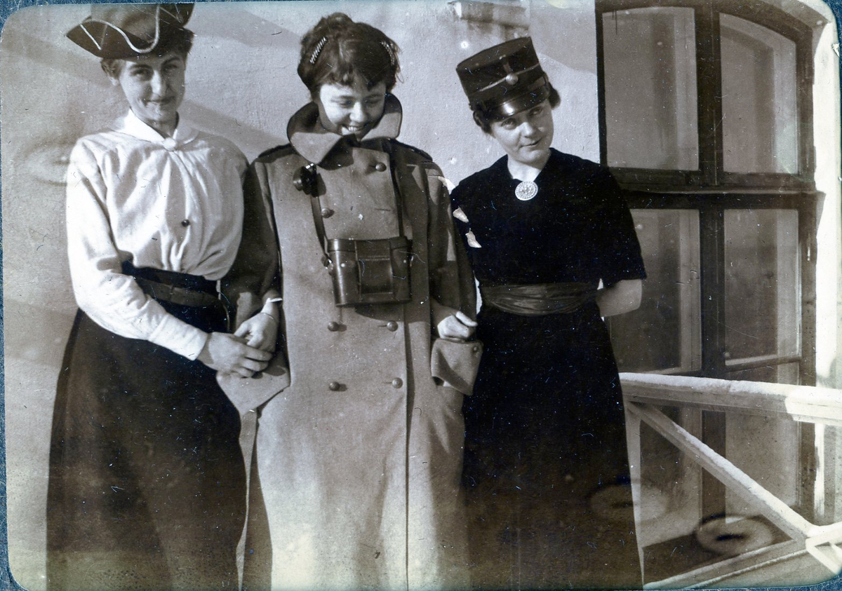 Titel: Tre damer delvis klädda i militärplagg. Kalmar regemente.