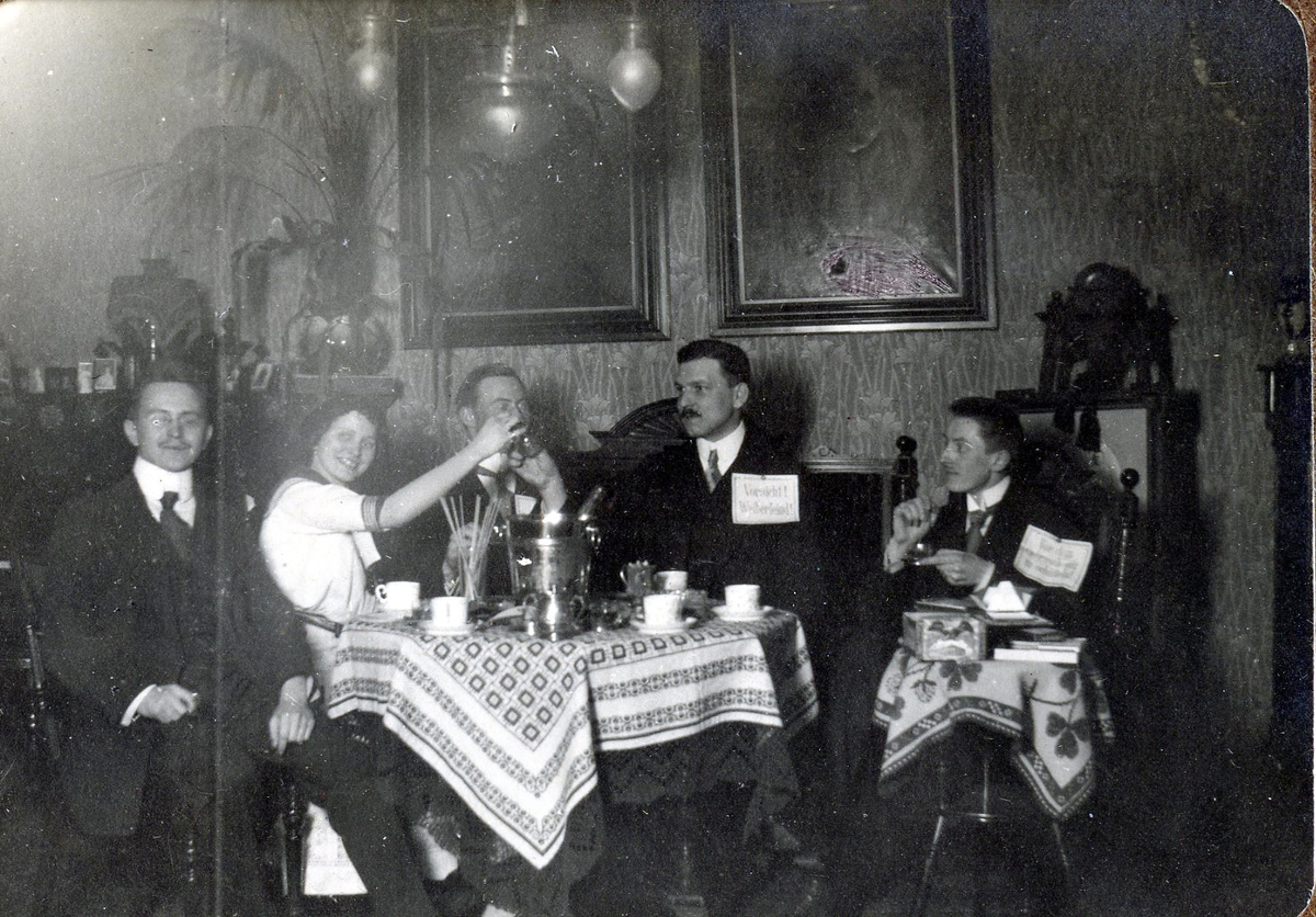 Titel: Civilklädda personer runt kaffebord med bl a champagnekylare.