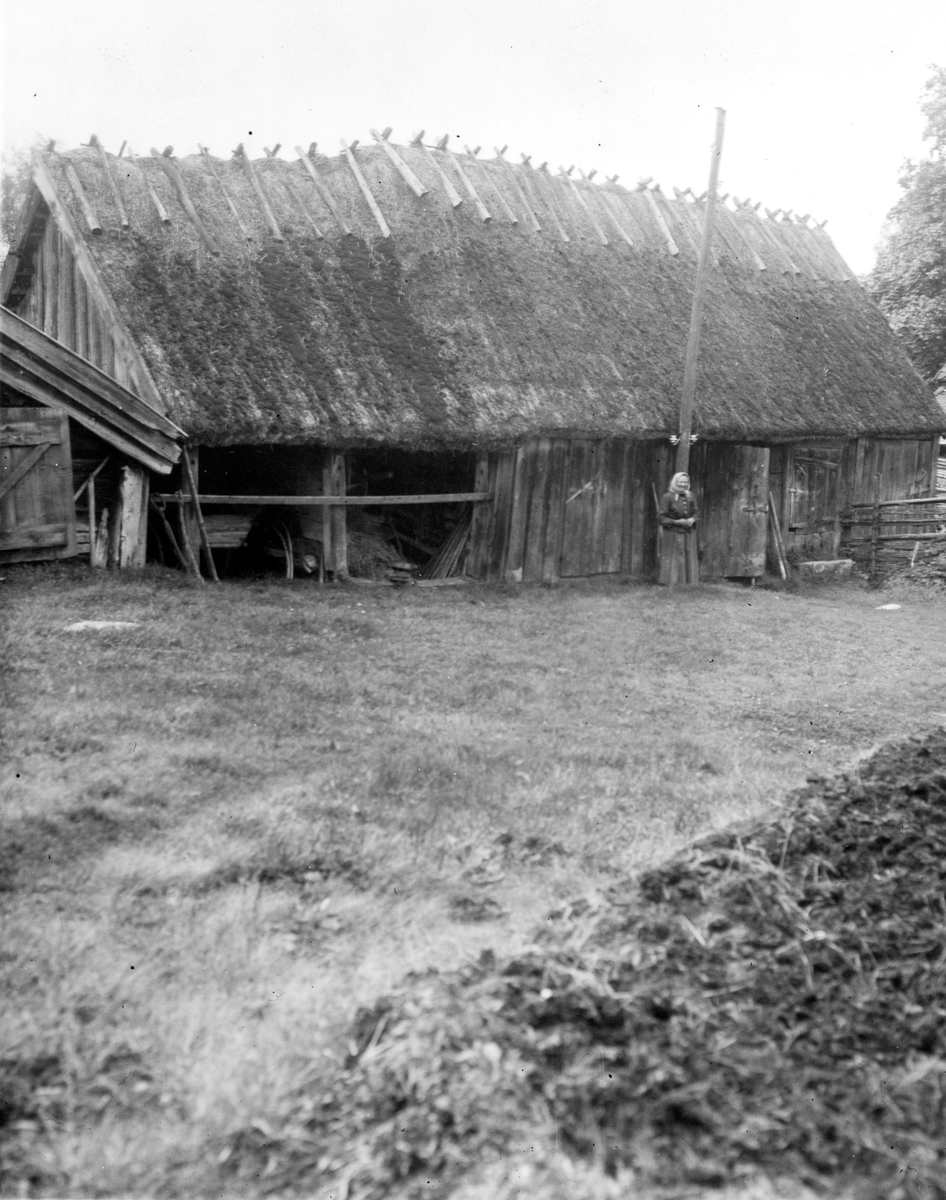 En gammal kvinna står utanför ett stall och vagnsskjul på Björnhult i Reftele socken. Längst till vänster en fårkätte.