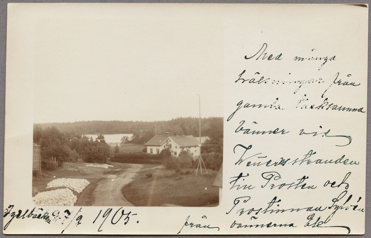 Titel: Hus vid vattendrag.