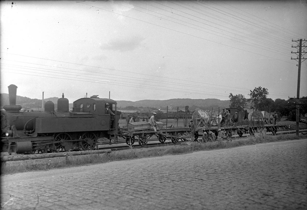 Statens Järnvägar, SJ Ke 772 med kabelläggningståg på 6 bansektionen. På linjen i närheten av Partille.