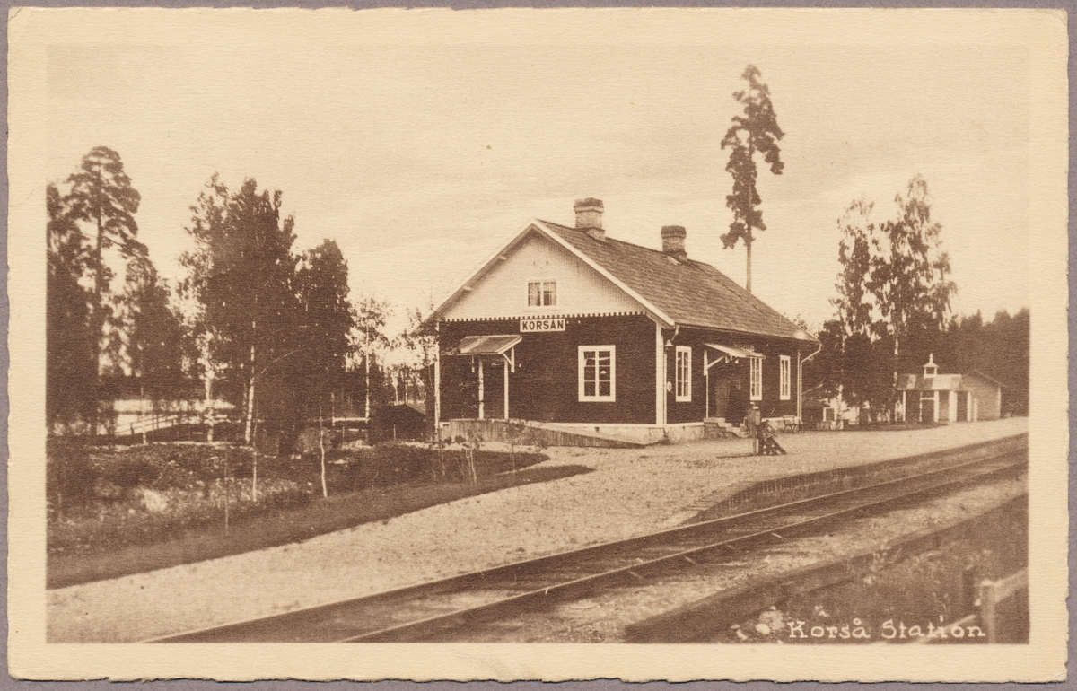 Titel: Vy på stationsområde med perrong och stationshus i bild.