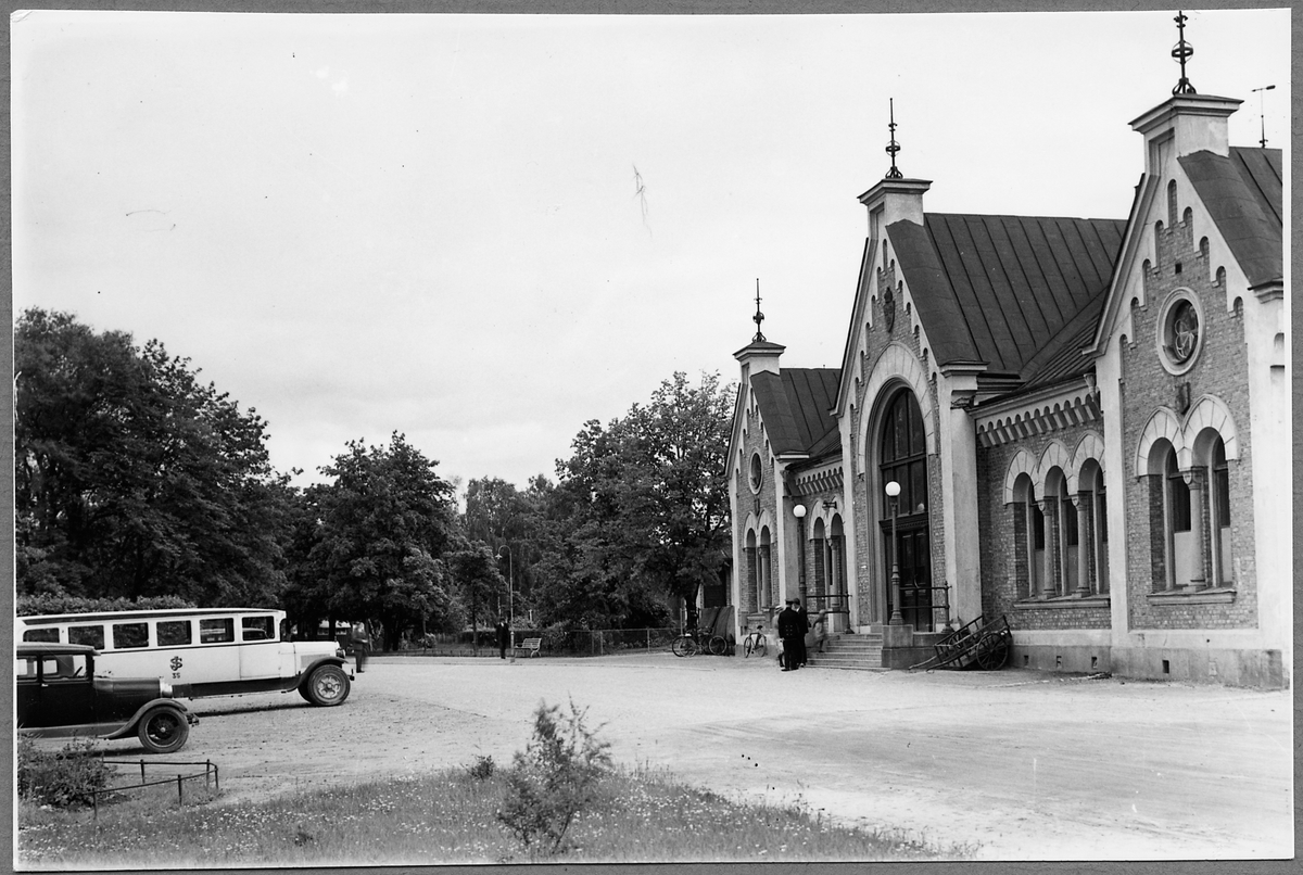 Hudiksvall stationshus från gatusidan med Statens Järnvägar, SJ buss 35 framför.