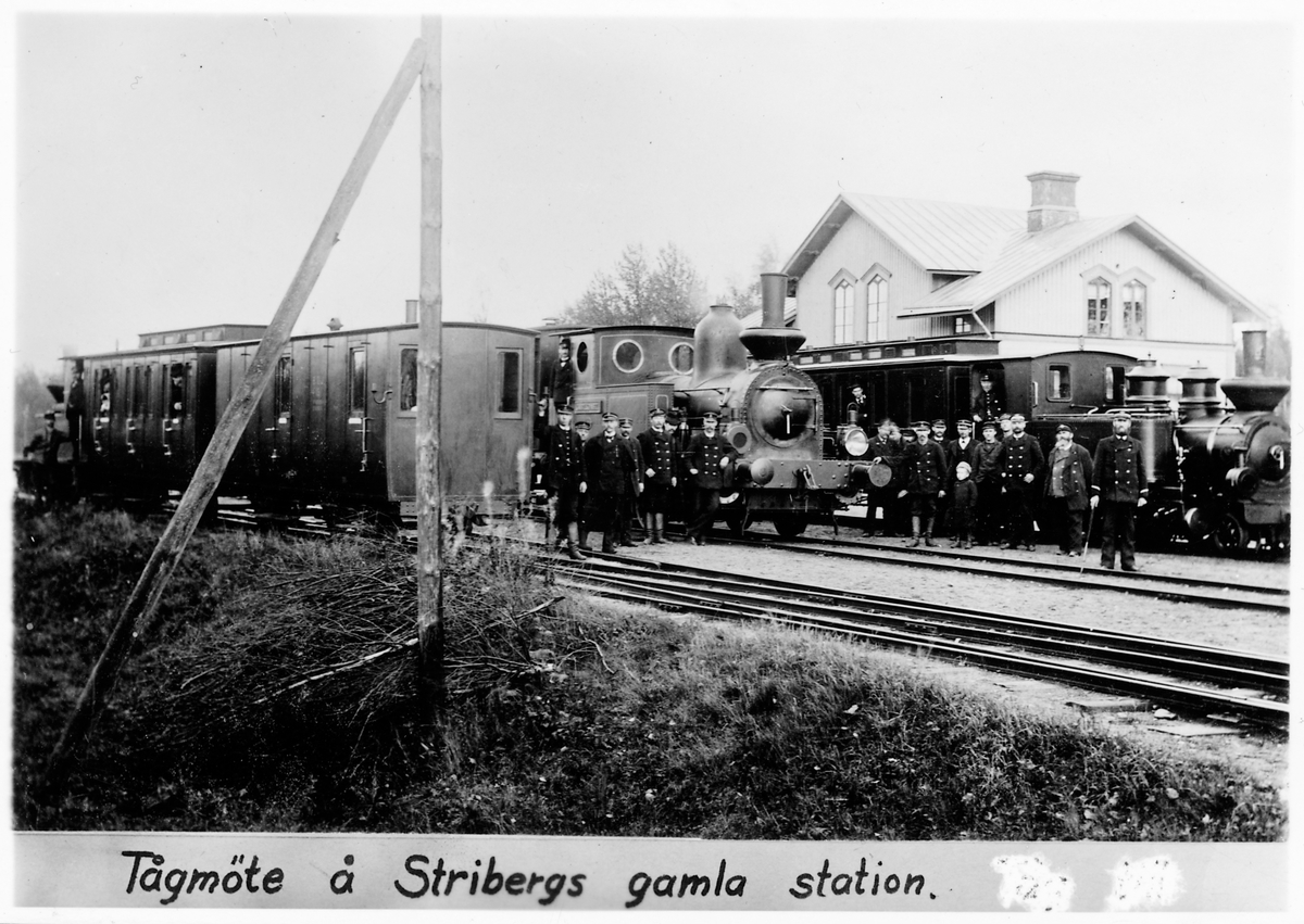 Tre persontåg möts på Stribergs station. Dessa dras av från vänster i bild: Vikern - Möckelns Järnväg, WMJ lok 1 "Degerfors" , Nora - Karlskoga Järnväg, NKJ lok 6 "Carlsdahl" , Vikern - Möckelns Järnväg, WMJ lok 4.
