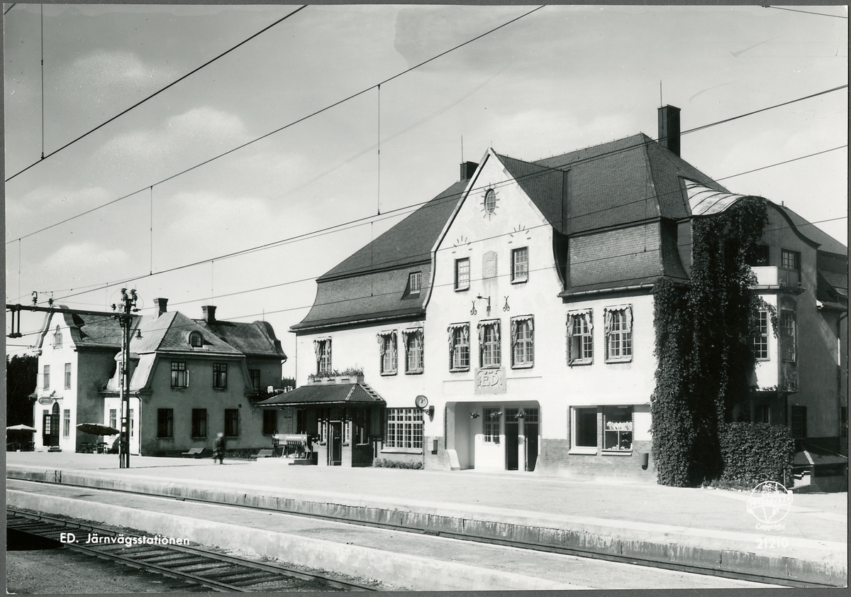 Titel: Stationen anlades 1879. Pingstaftonens förmiddag 1910 brann stationen ned till grunden tillsammans med Hotell Drott, Lilla Hotellet och Järnvägshotellet. Stationsbyggnaden var från sitt ursprungliga skick påbyggd med en våning, samt en farstu norrut. 1912 stod det nya stationshuset färdigt. Intill dess användes en reservstation i en fastighet som tillhörde DJ och som låg vid spårområdet på södra sidan. DJ , Dalslands Järnväg