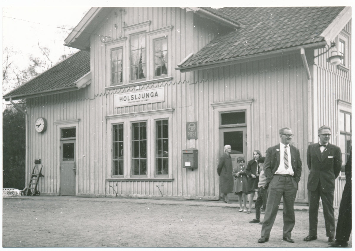 Falkenbergs Järnväg, FJ Holsljunga station 1960-04-30.Några samhällsbor vid tiden för tåg 158 (näst sista tåget) nedlagt av bandelen Älvsered-Axelfors-Hillared 1961 -05-01