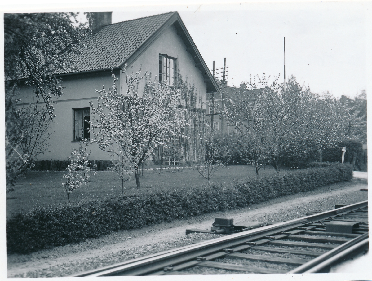 Titel: Bostadshus med trädgård vid järnvägsspår i Ljungskile.
