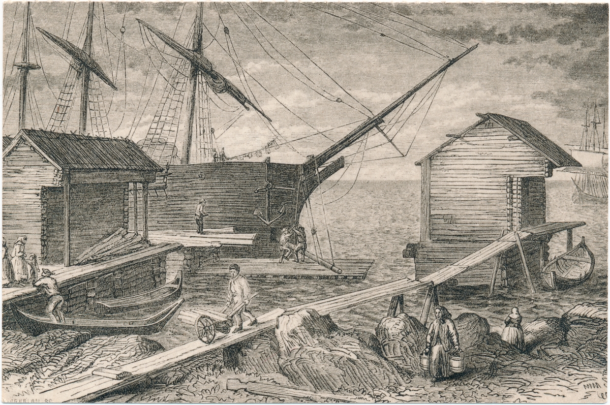 Träsnitt efter teckning Parti från Luleå hamn med dess uthamnsbrygga en tid innan malmtransporterna hade börjat.