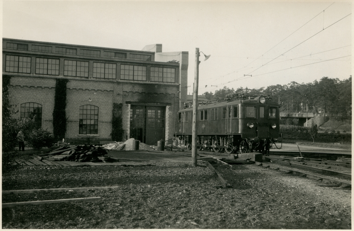 Titel: Exteriör av Hagalunds lokstation med ett Statens Järnvägar SJ Ds lok.