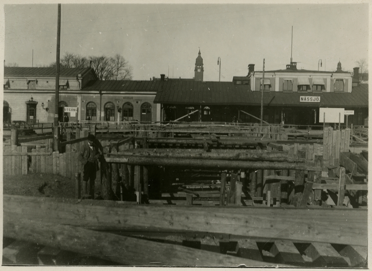 Titel: Spånt för tunnelbyggnaden samt provisorisk bro under byggnadstiden.
