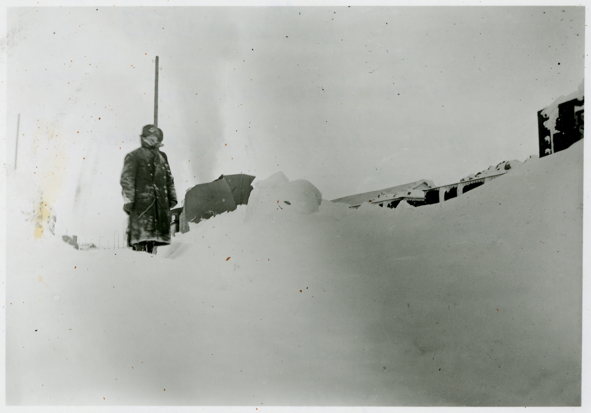 Titel: Snöplogen "Amerikanaren" i verksamhet på Riksgränsens bangård. Den inköptes 1907.