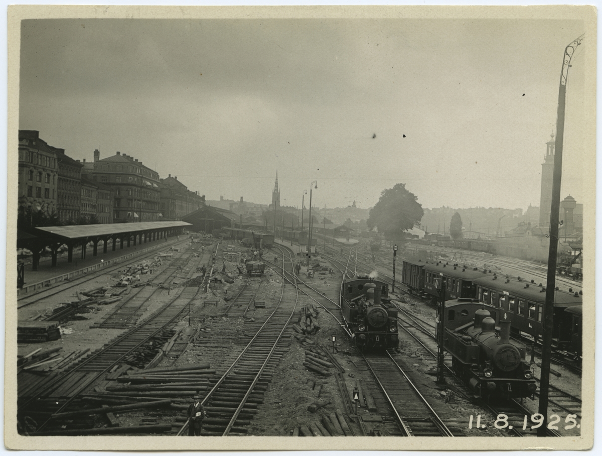 Ombyggnad av plattform 2 vid Stockholms Central. Loken är av typen Statens Järnvägar, SJ Ke. Vagnarna till höger är en resgodsvagn SJ F1, SJ C3d och en SJ C3e eller C3g.