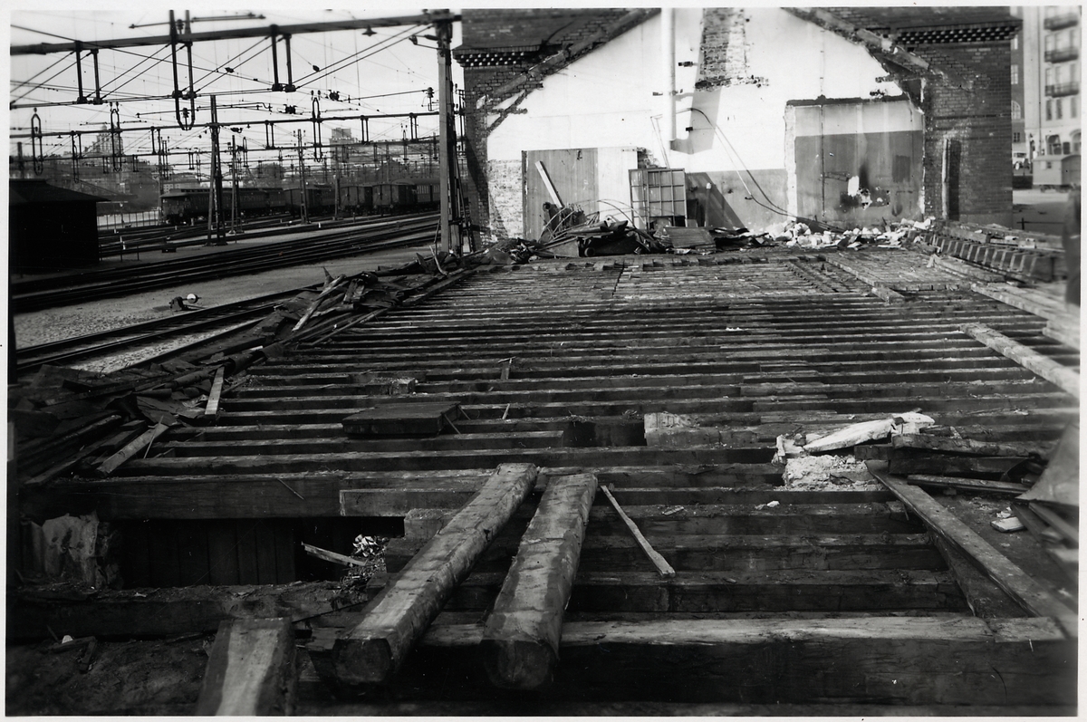 Titel: Rivning av magasinen vid Norra bantorget. Norra bantorgets stationshus skymtar bakom den vita gaveln.