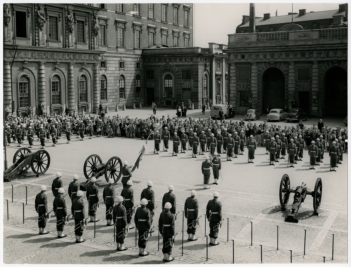 Statens Järnvägar, SJ III distrikt driftvärn går högvakt på Stockholms Slott 1954.