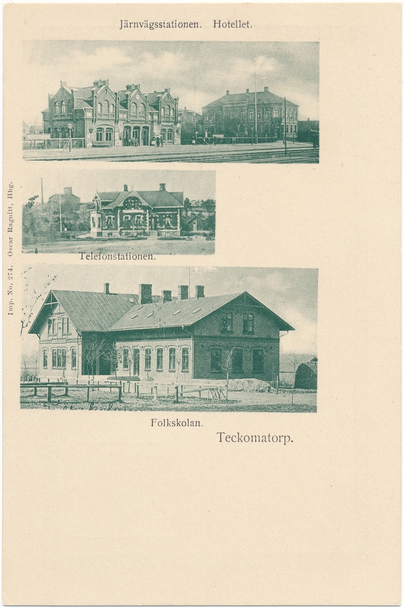 Teckomatorp bestående av järnvägsstationen, järnvägshotellet, telefonstationen och folkskolan.