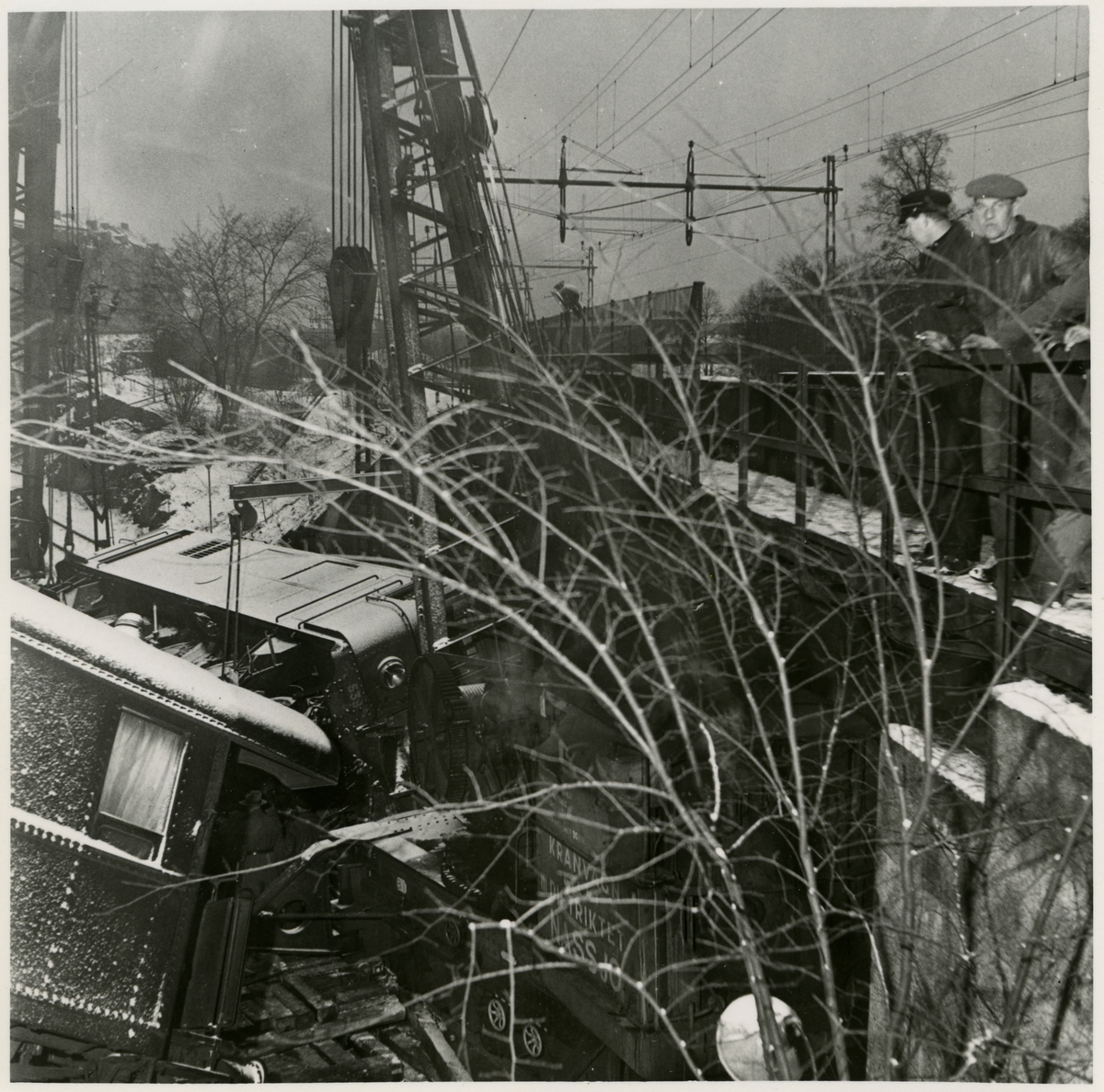 Statens Järnvägar, SJ Dk 539. Urspårning av lok och kranarbete med ångkran "Nässjö" vid Tomteboda.