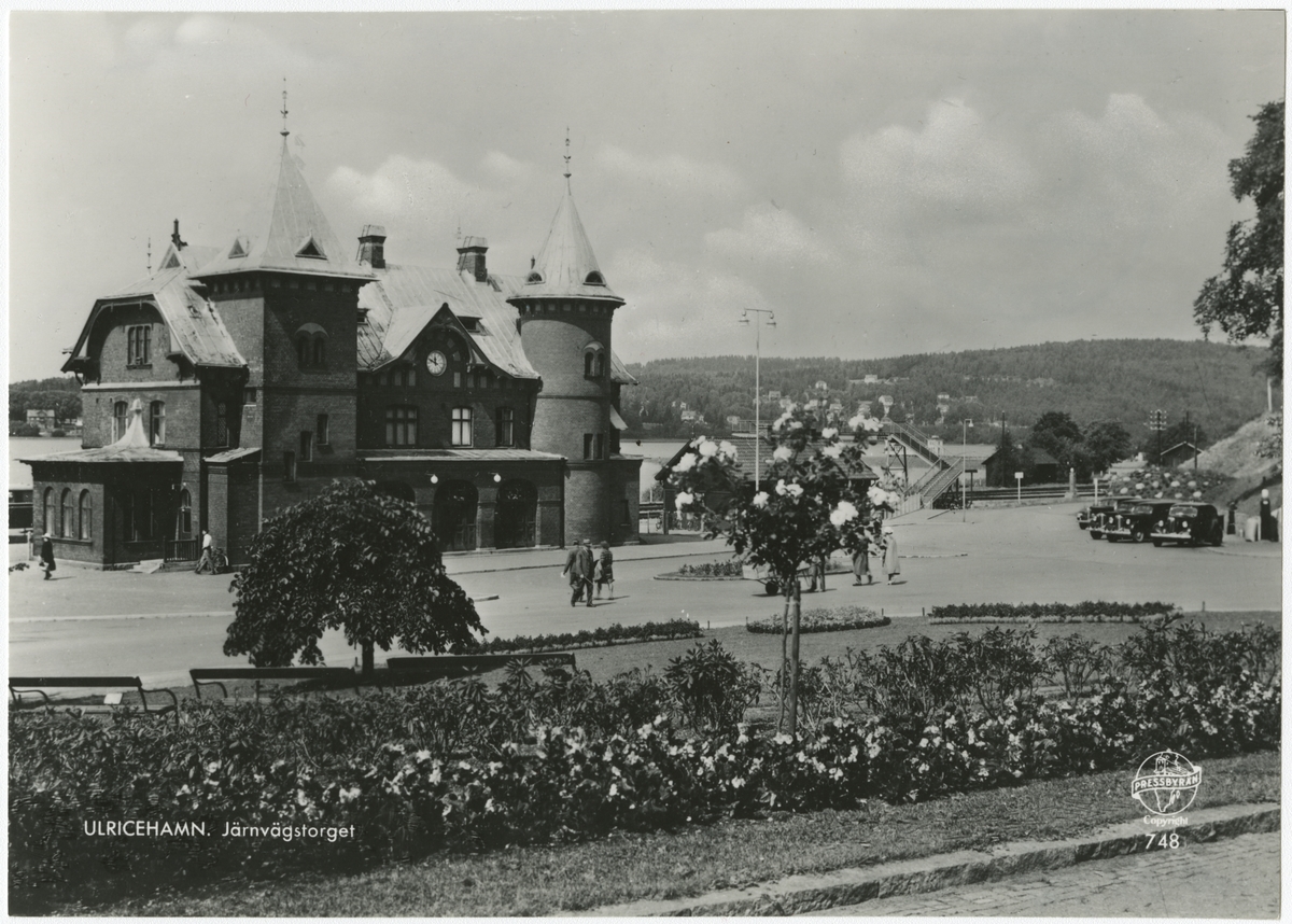 Titel: Ulricehamn station sedd från gatusidan. Äldre personbilar till höger.