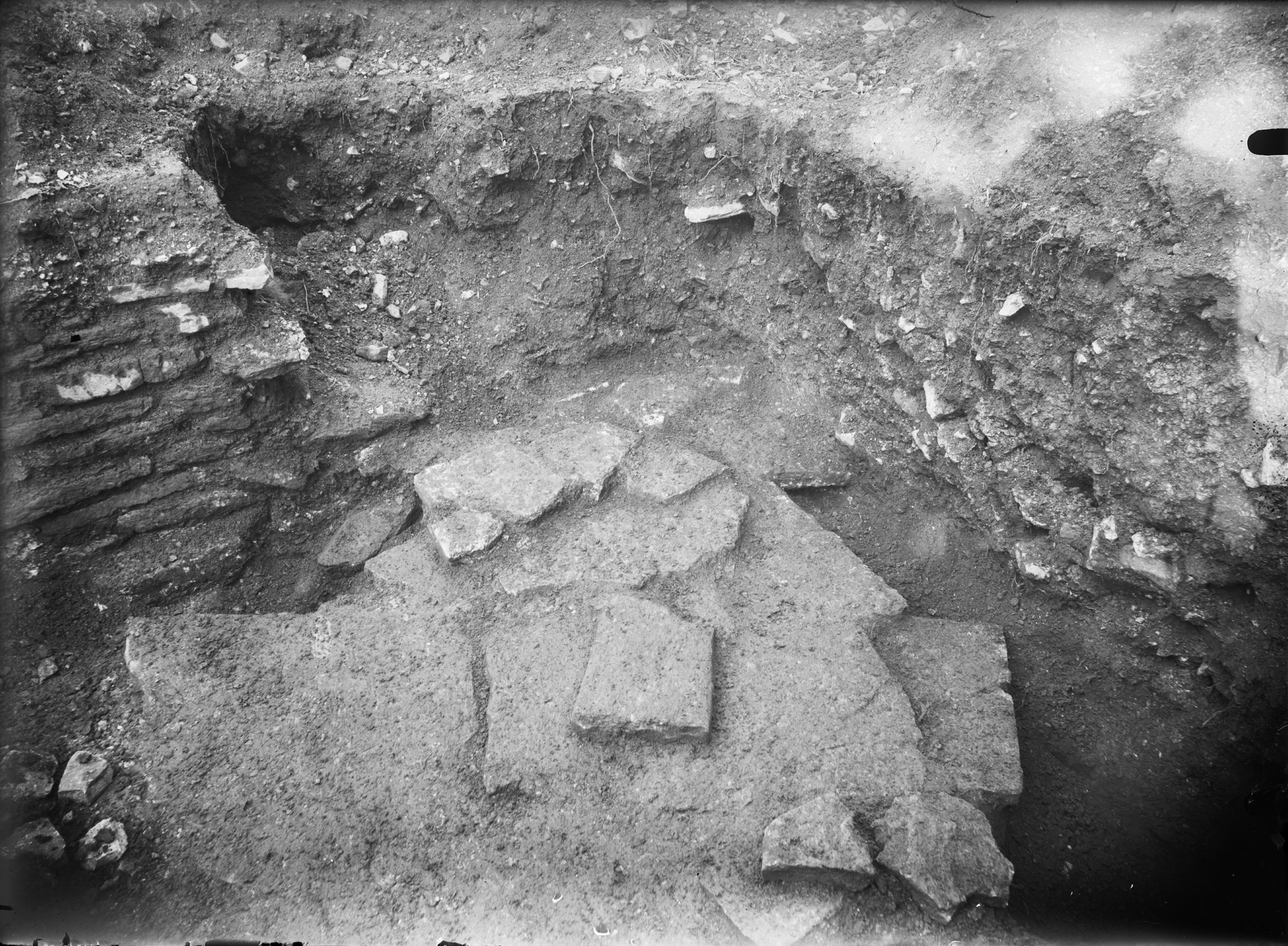Rester av mur och golv i tillbyggnaden utanför östra förstugan, nordöstra hörnet. Från sydväst.