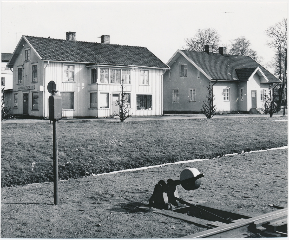 Vårgårda station. Statens Järnvägar, SJ. De första husen vid Vårgårda station, järnvägens boställshus till höger. Banan öppnades 1857, elektrifiering 1926 och fick dubbelspår 1954.