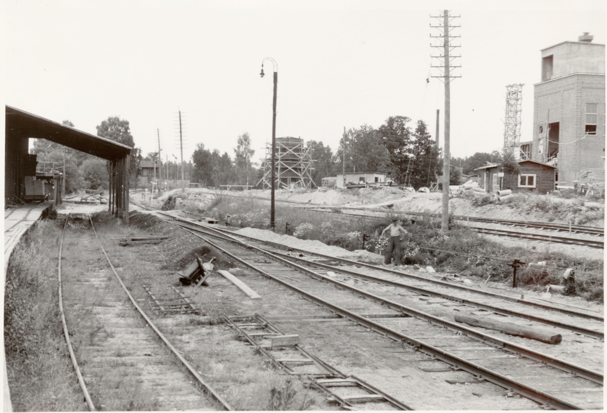 Vrena foto mot söder, en man står och gräver. Trafik började 1876, Sidospår till sågverket 1921-10-01, brädgården 1938-05-15.
