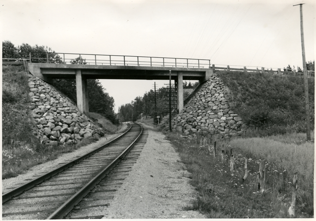 På linjen mellan Flen - Mellösa, vägbro, mot norr. Bilden tagen inför elektrifieringen av Trafikaktiebolaget Grängesberg - Oxelösunds Järnvägar.