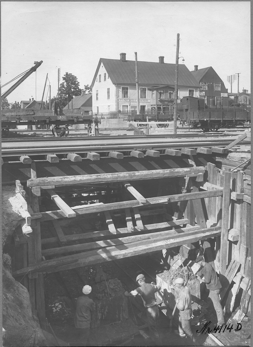 Grävning för gångtunnel i Hässleholm. Statens Järnvägar, SJ N 30710 och SJ N 11910 syns på bild.