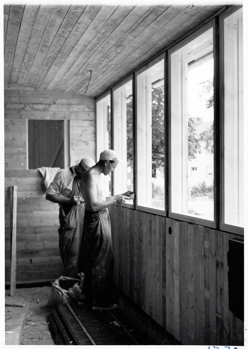 Titel: Drevning av fönster under byggnaden av Sigtuna busstation.