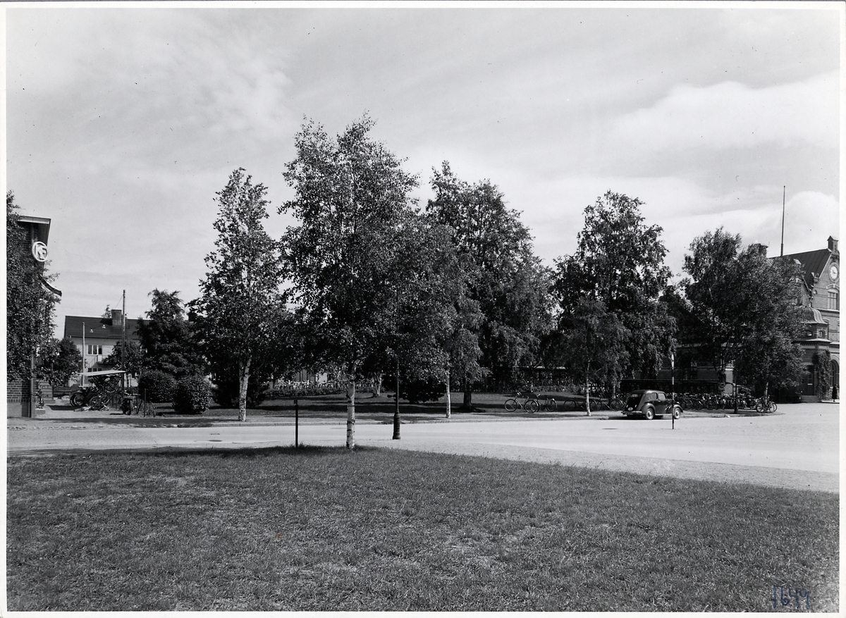 Stadsbild med Kooperativa Förbundet, KF, till vänster och stationen till höger.