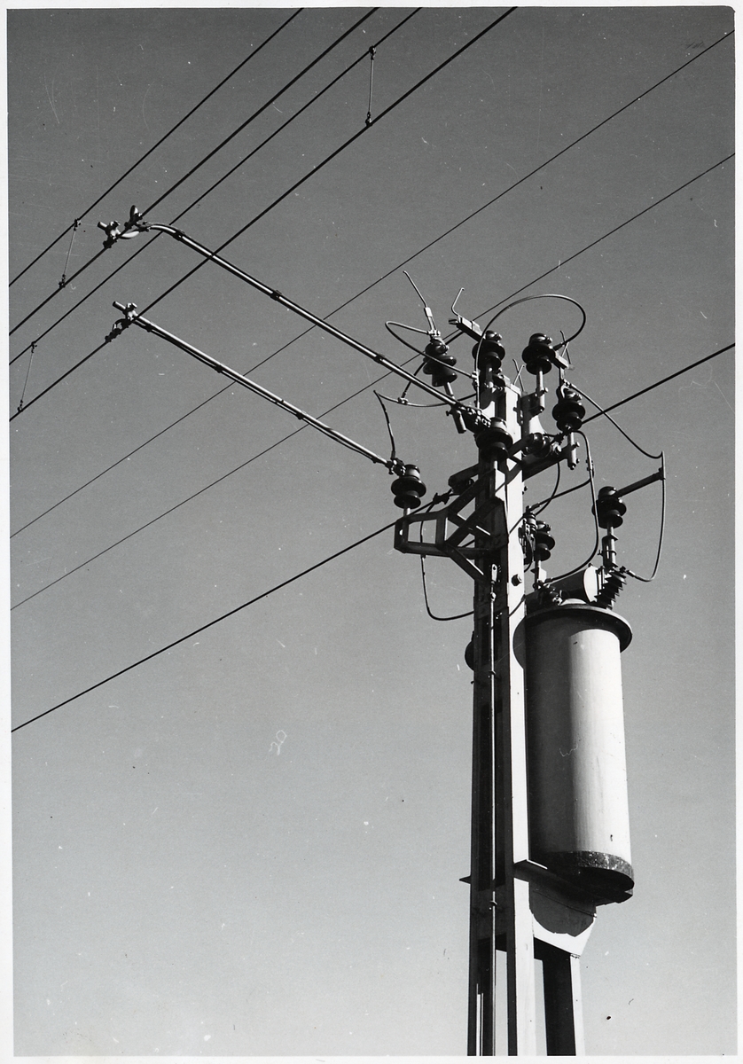 Titel: Toppen av en kontaktledningsstolpe med sugtransformator.