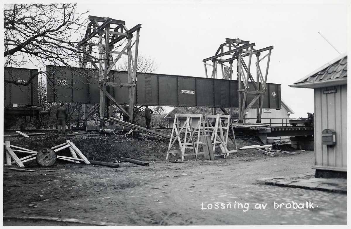 Titel: Lossning av brobalk under byggandet av nya järnvägsbron i Falkenberg.