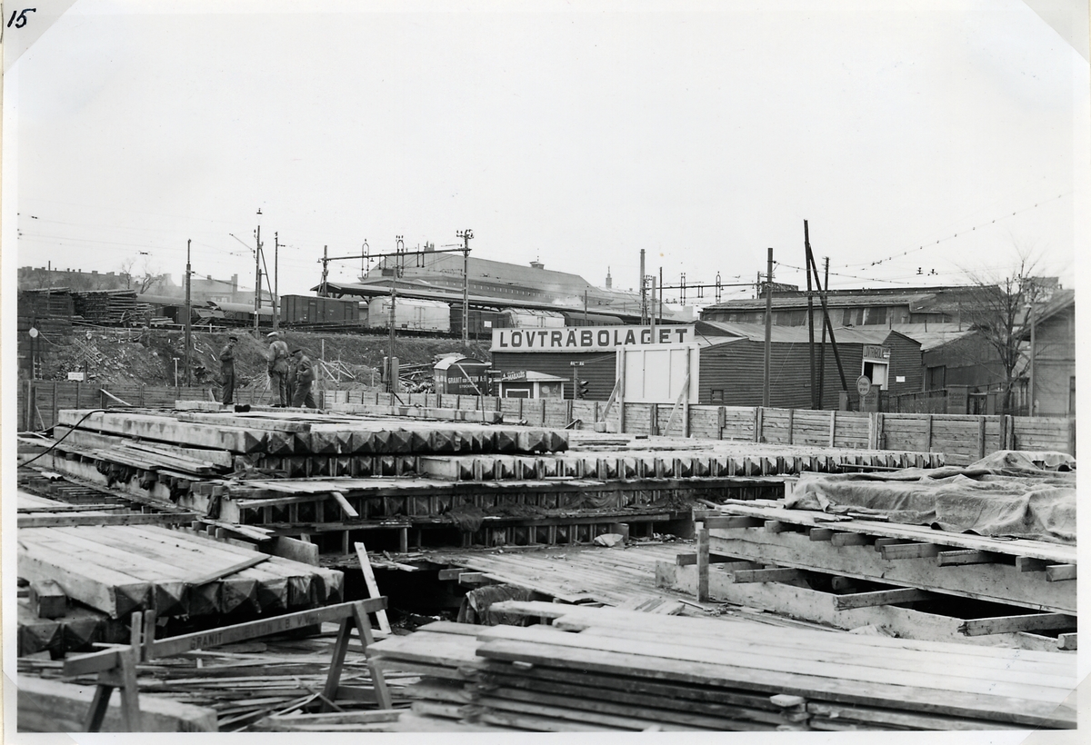 Titel: Byggnationen av ny järnvägsviadukt över Norrtullsgatan. Norra brodelen. Pålupplaget.