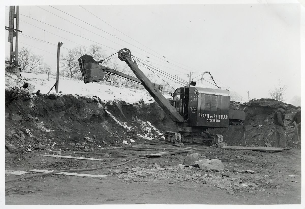 Titel: Byggnationen av ny järnvägsviadukt över Norrtullsgatan. Bortschaktning av gamla järnvägsbanken.