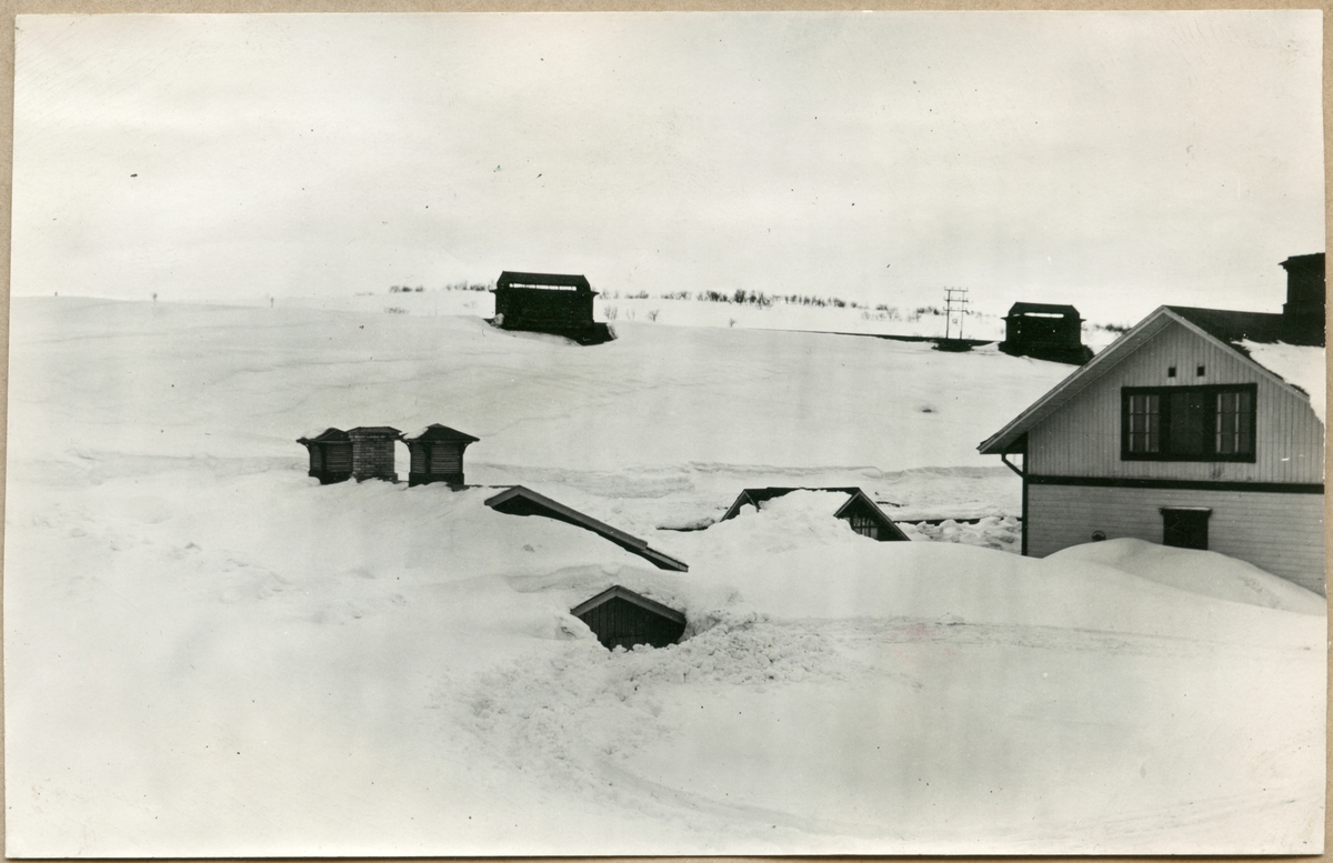 Titel: Översnöat hus. I bakrunden syns en järnväg.