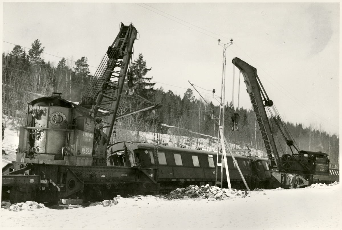 Titel: Tåg 93, Nordpilen, efter urspårning på sträckan mellan Simeå och Undersvik 1956-03-27.