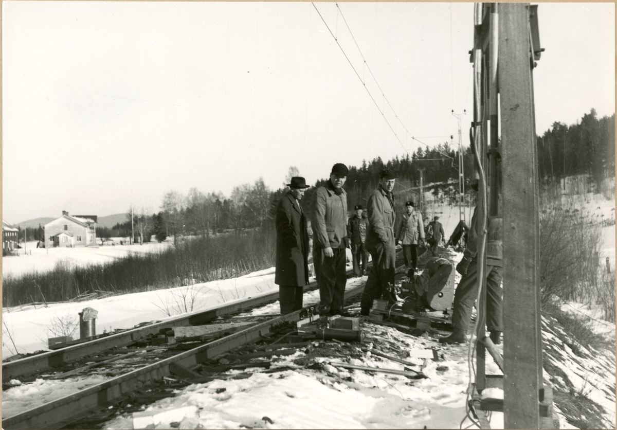 Banarbete efter urspårning av tåg 93, Nordpilen, på sträckan mellan Simeå och Undersvik 1956-03-27.