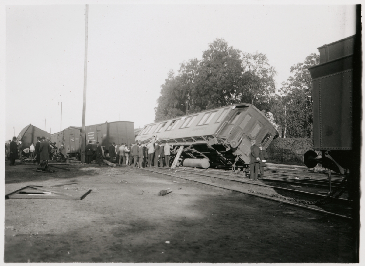 Titel: Vagnar och folksamling vid olycksplats på bangård.