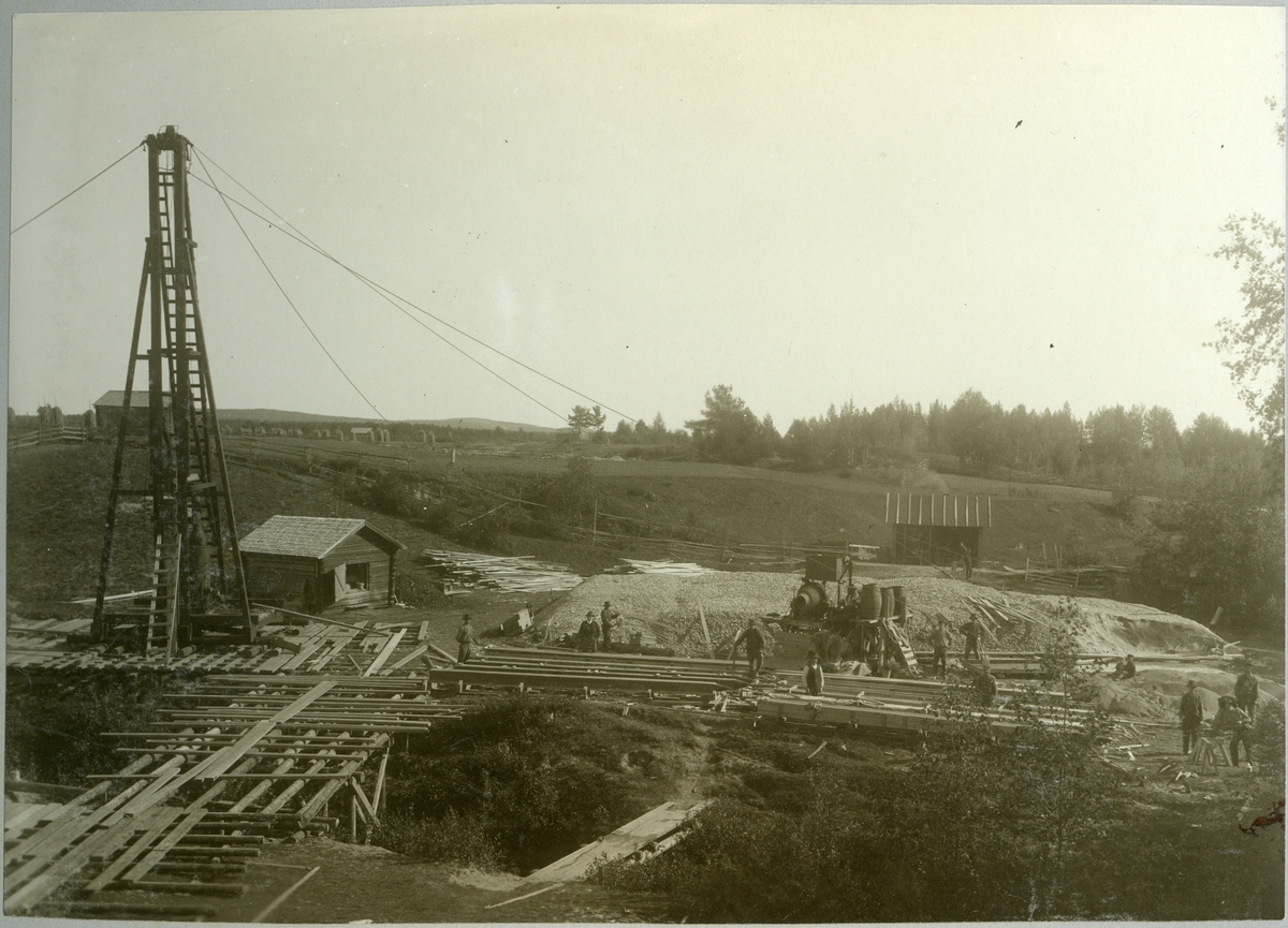 Medle. Statens Järnvägar, SJ. Brobygget över Bjurån i september 1910.