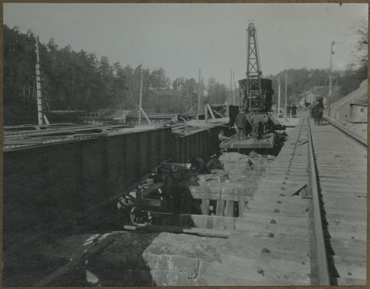 Titel: Dubbelspårsbyggnaden mellan Alingsås - Olskroken. Jonsered bro nummer 010. Gamla överbyggnaden borttages med ångkran.