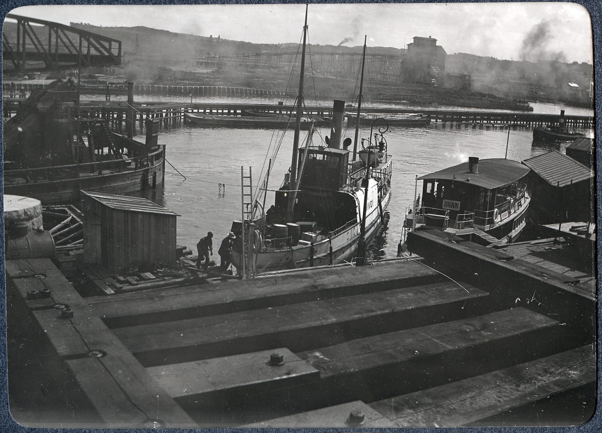 Titel: Album med fotografier från Bohusbanan. Båtar uppehållande provisoriska trafiken.