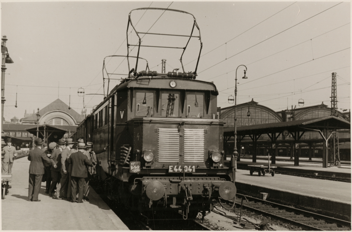 Titel: Persontåg driven av ellok vid station. Loket har nummer E44 041.