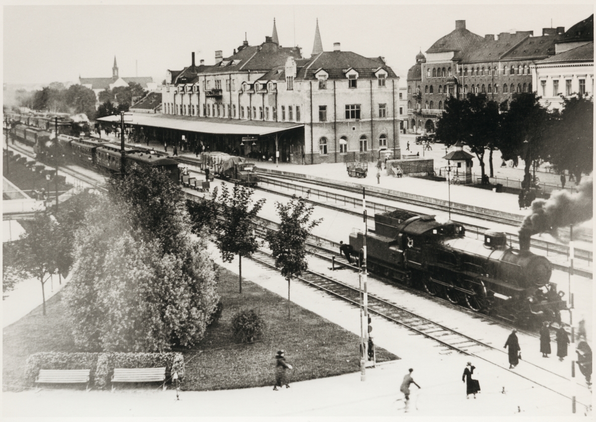 Vy på stationsområde med bangård och del av järnvägsövergång i bild.