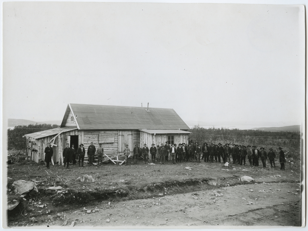 Järnvägspoliser och rallare utanför avlöningsbaracken vid Torneträsk sommaren 1901